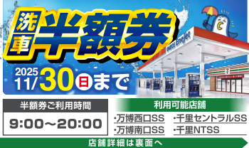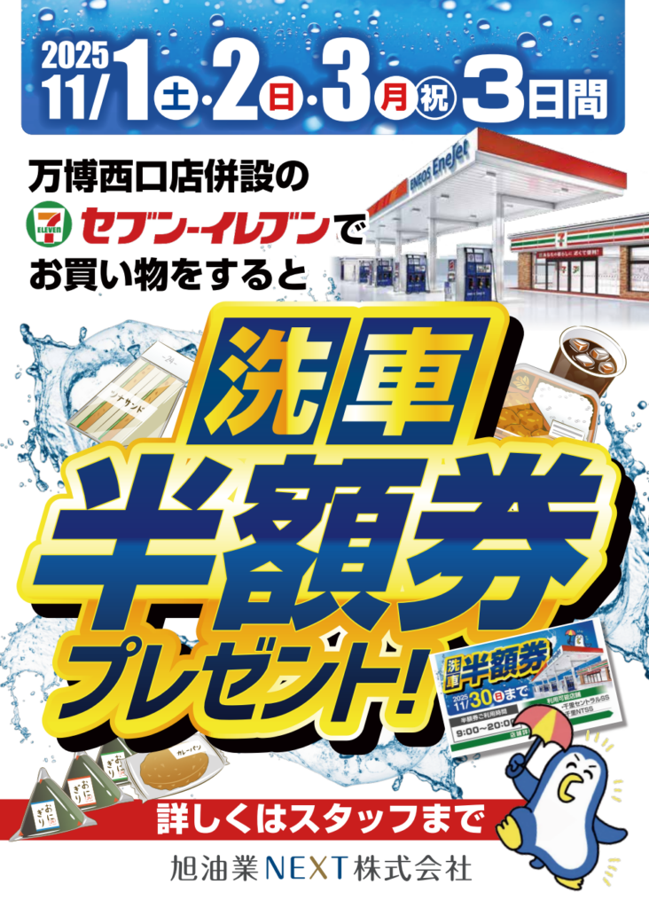 弊社の万博西口SS併設のセブンイレブン運営者が変わりました。そこでセブンイレブンでお買い物をすると、なんとなんと弊社の北摂4SSで利用できるクーポンをプレゼント!!